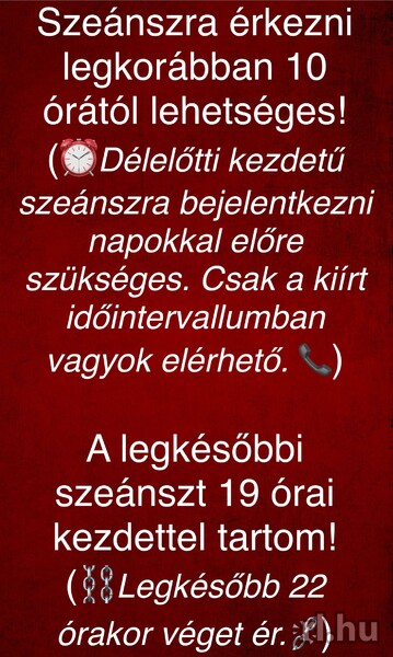 Bejelentkezni napokkal előre érdemes, de minimum a találkozó előtt 2 órával szükséges! Egyben ragadd meg az alkalmat és jelezd előre kívánságaid. Ennek hiányában nem biztos, hogy teljesülni fognak!